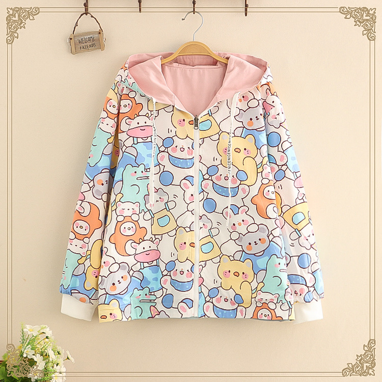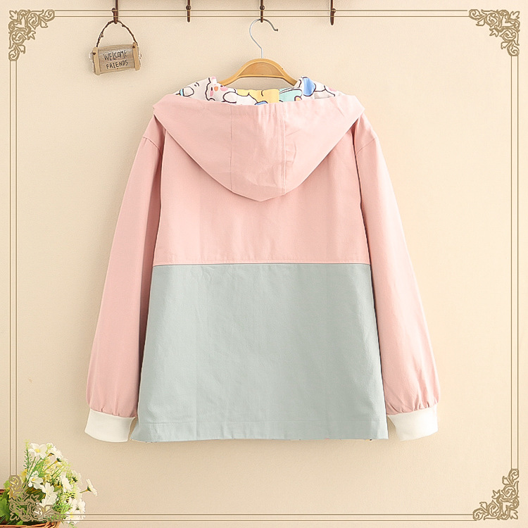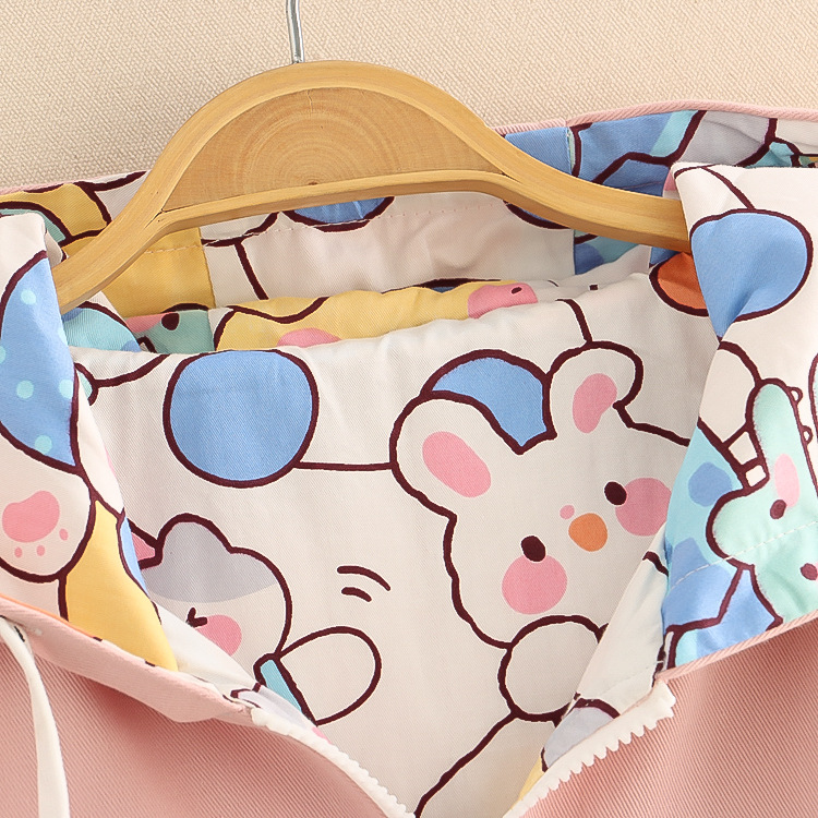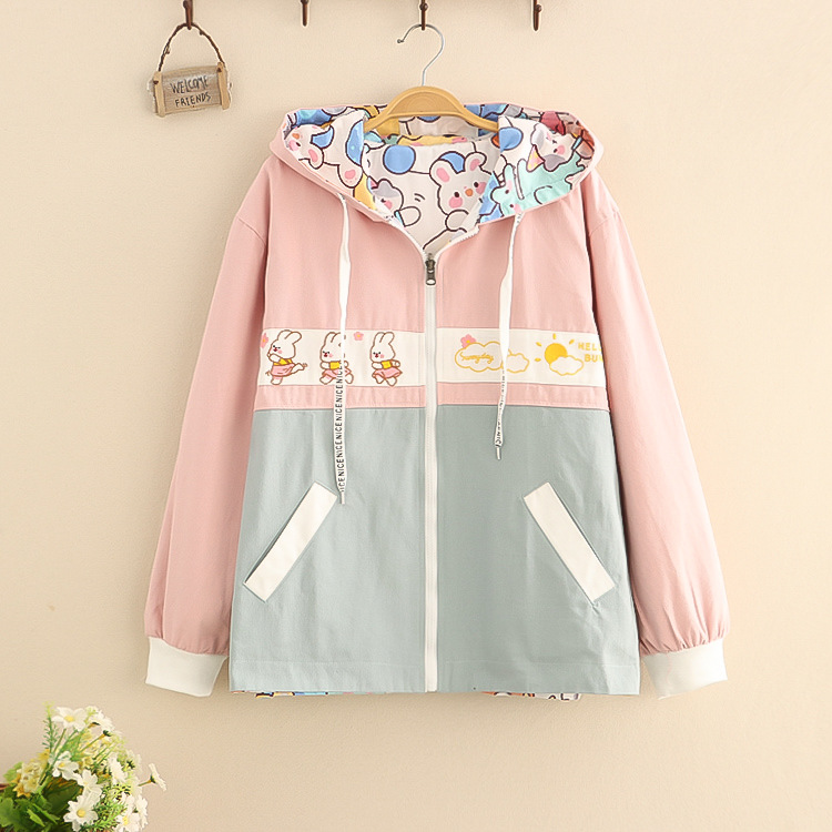 College style contrast color stitching cartoon rabbit embroidery hooded double-sided jacket