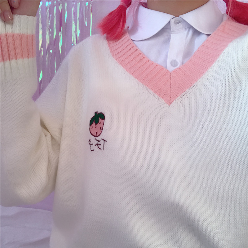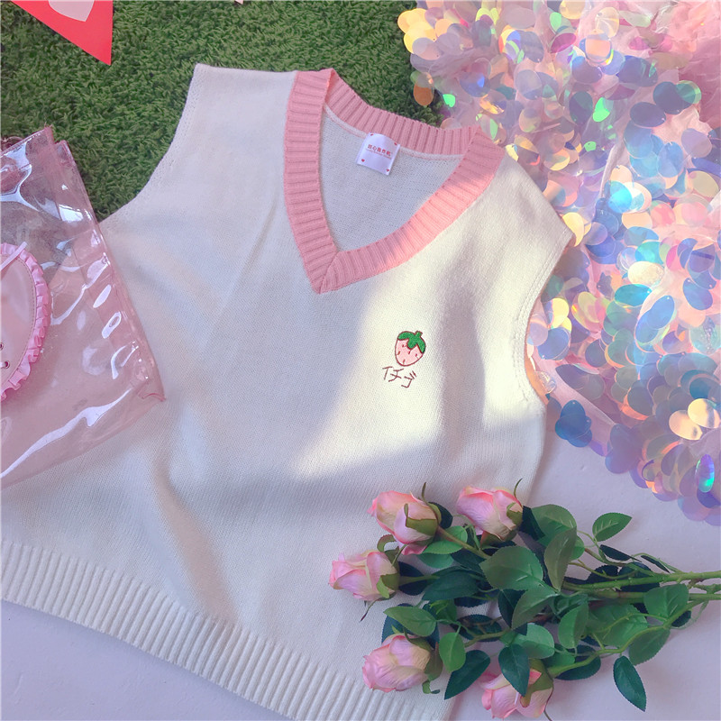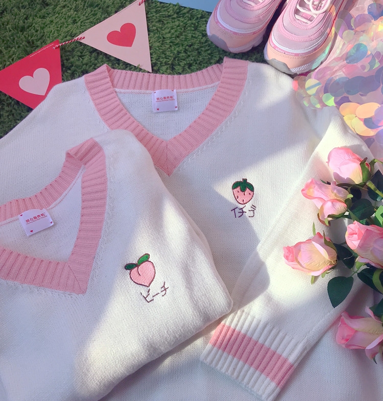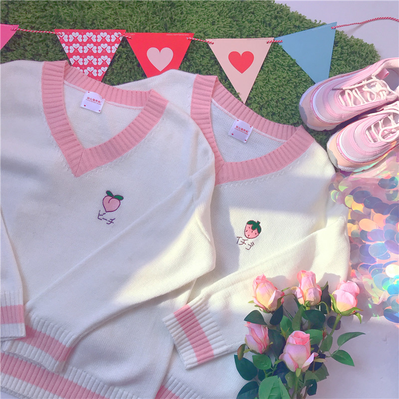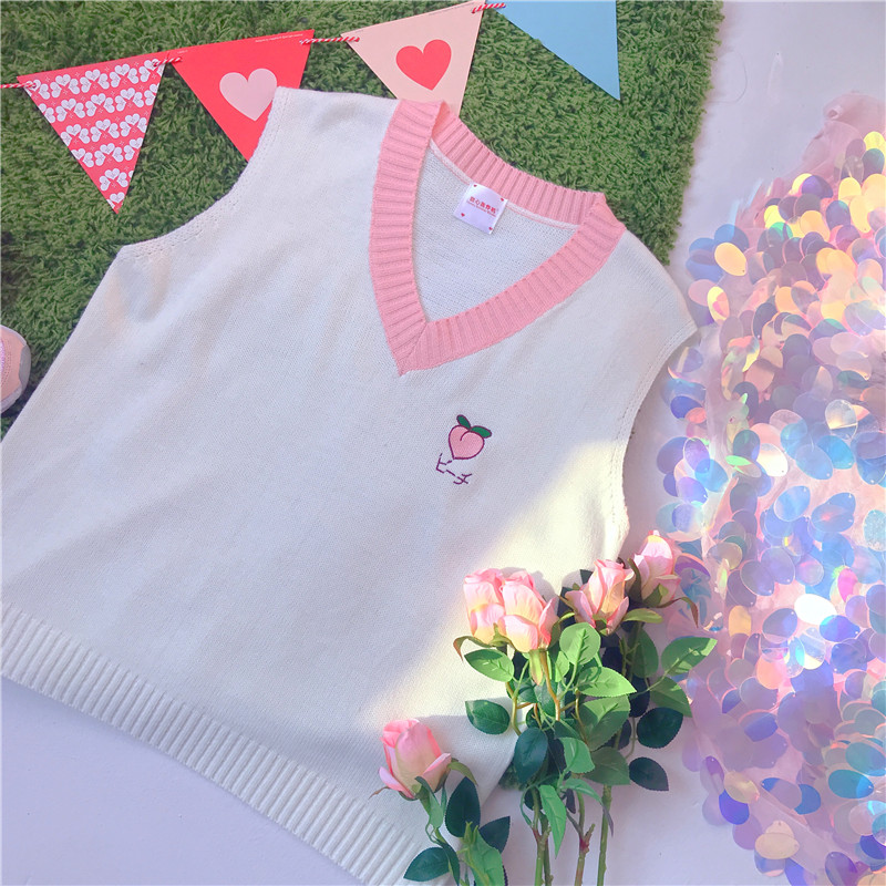 New Women's V-neck Sweet Peach Strawberry Embroidery JK Uniform Vest Sweater