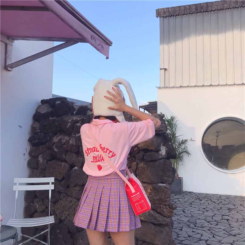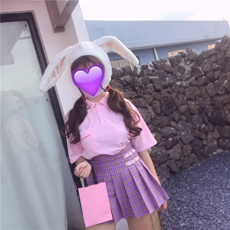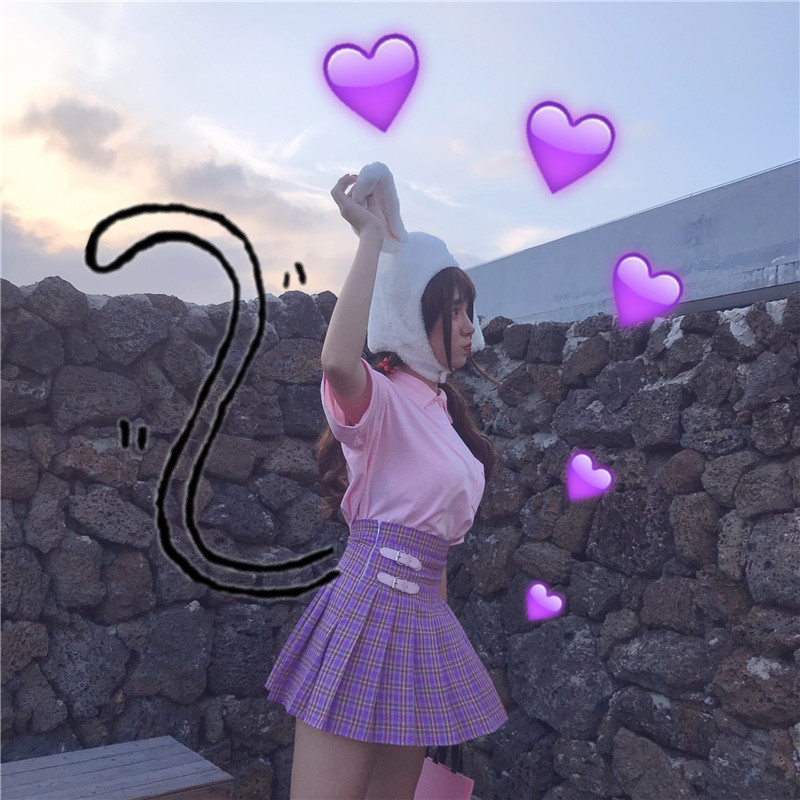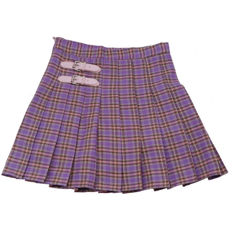 New pink leather buckle high waist plaid skirt