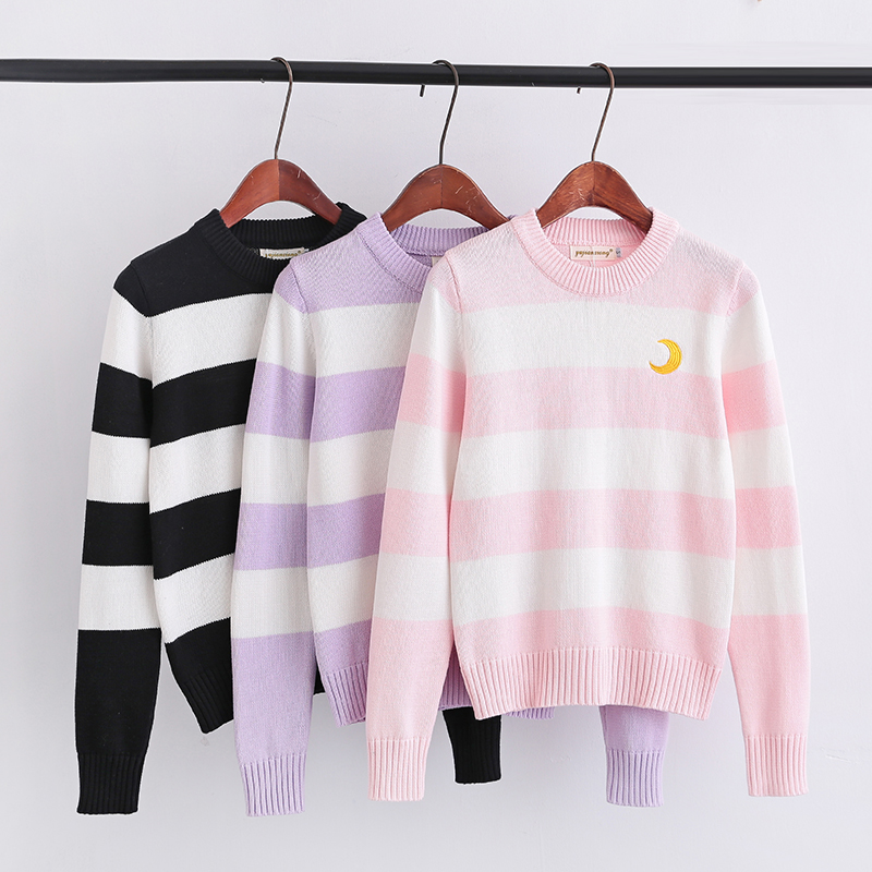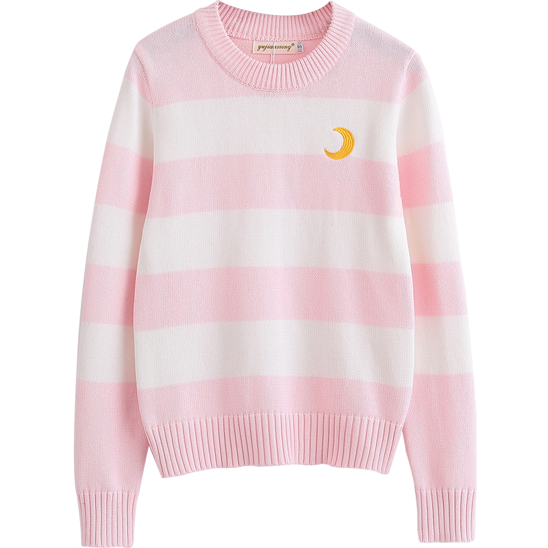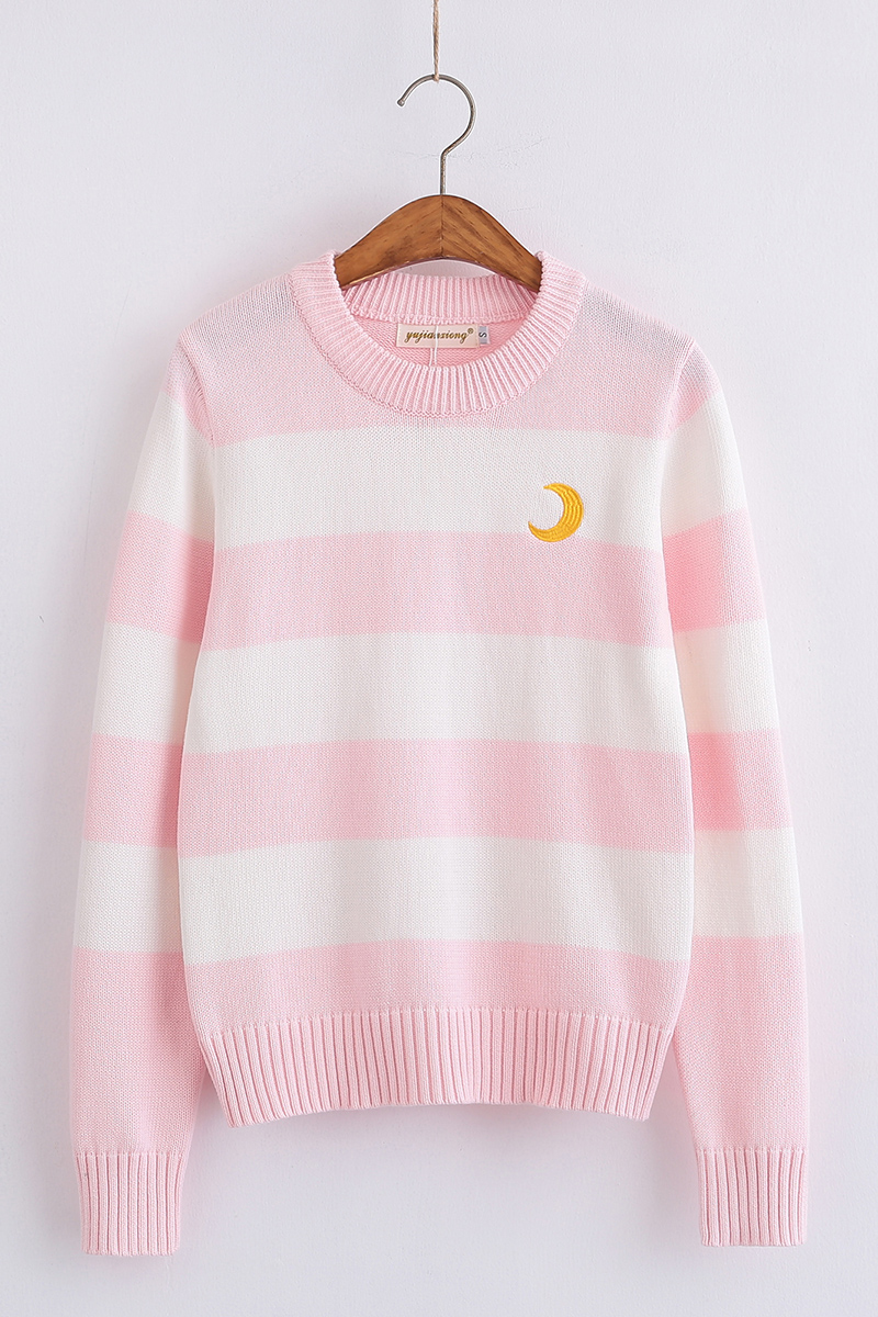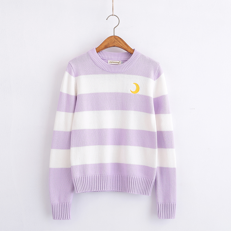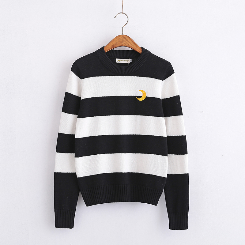 New College Wind Moon Embroidered Striped Crew Neck Sweater