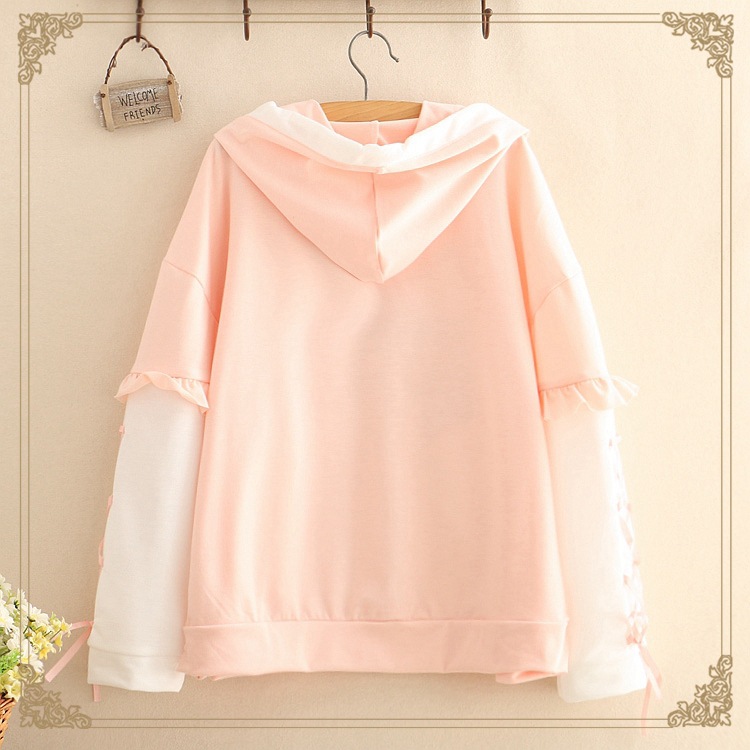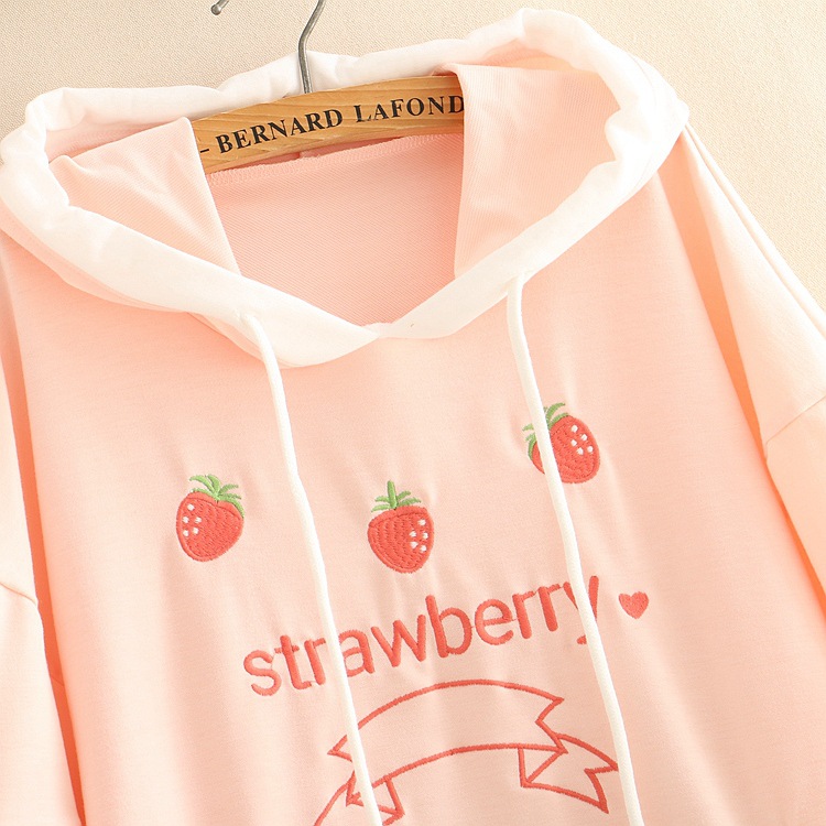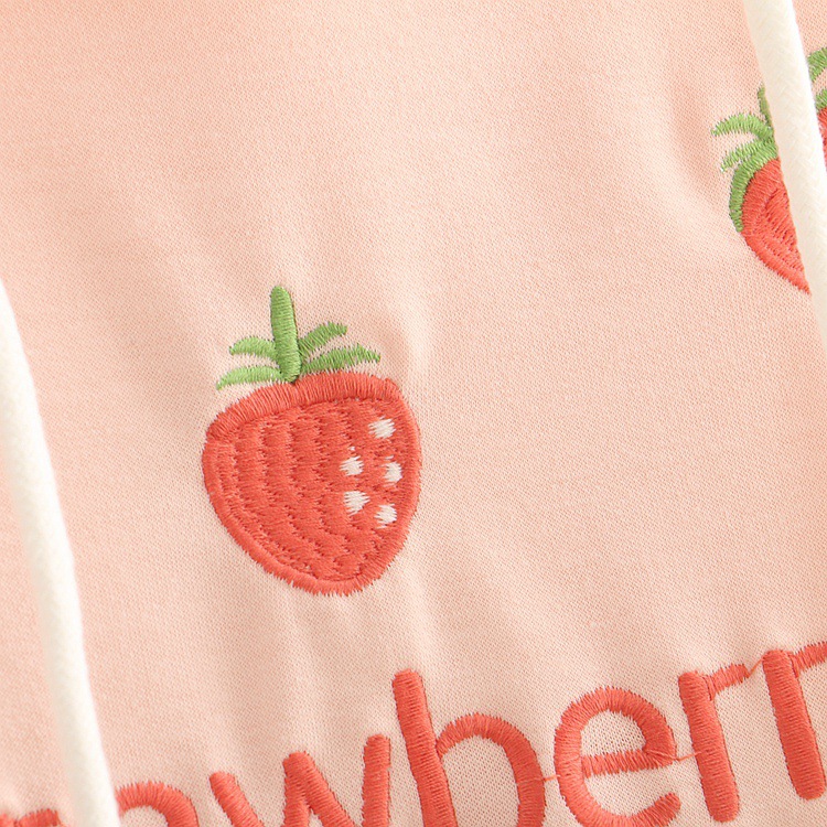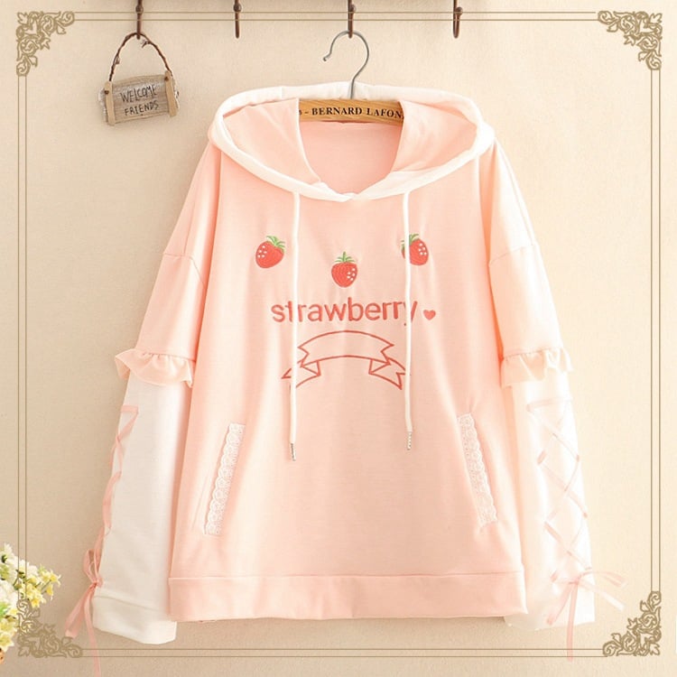 Sweet Strawberry Embroidered Lace-up Lace Hooded Sweatshirt