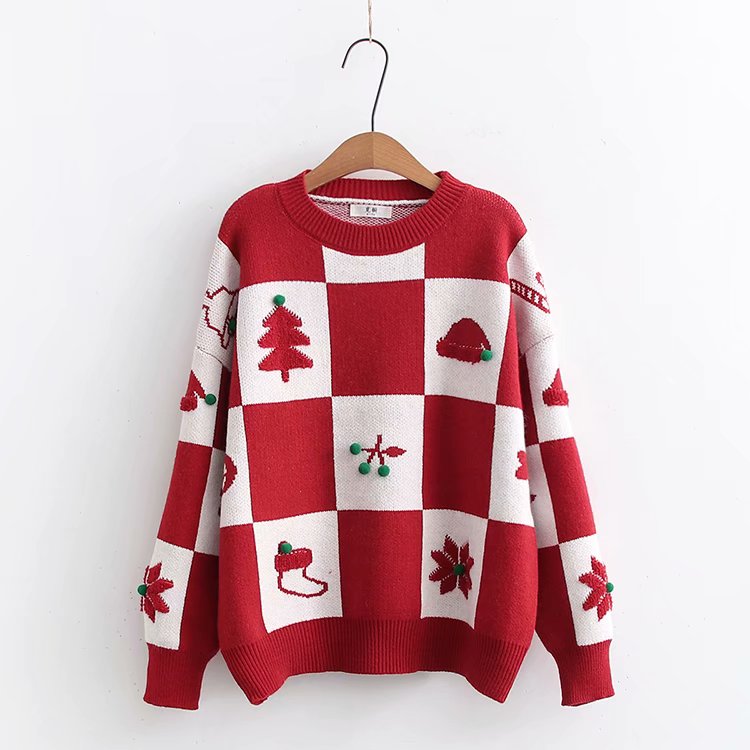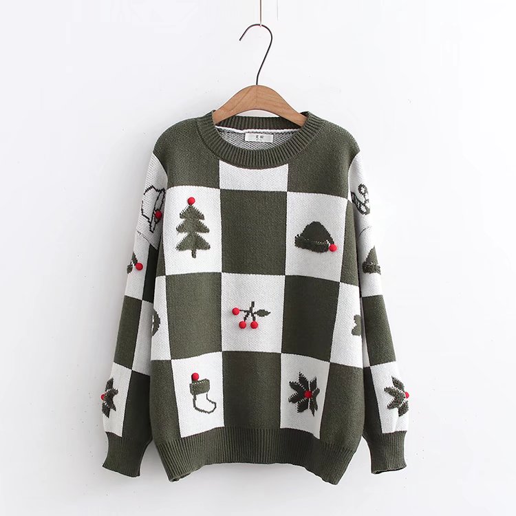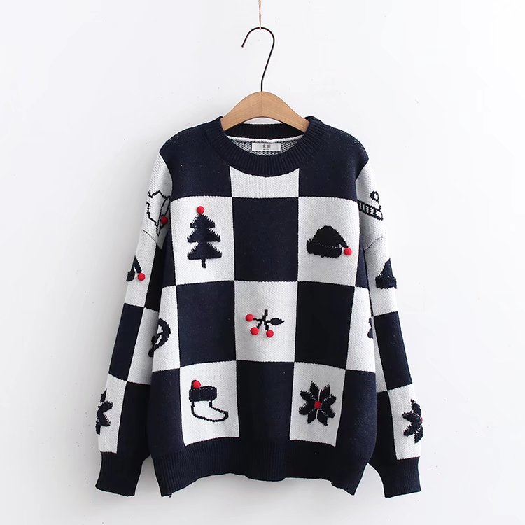 New Christmas Checkerboard Three-dimensional Embroidered Sweater