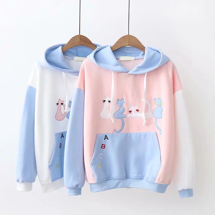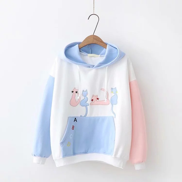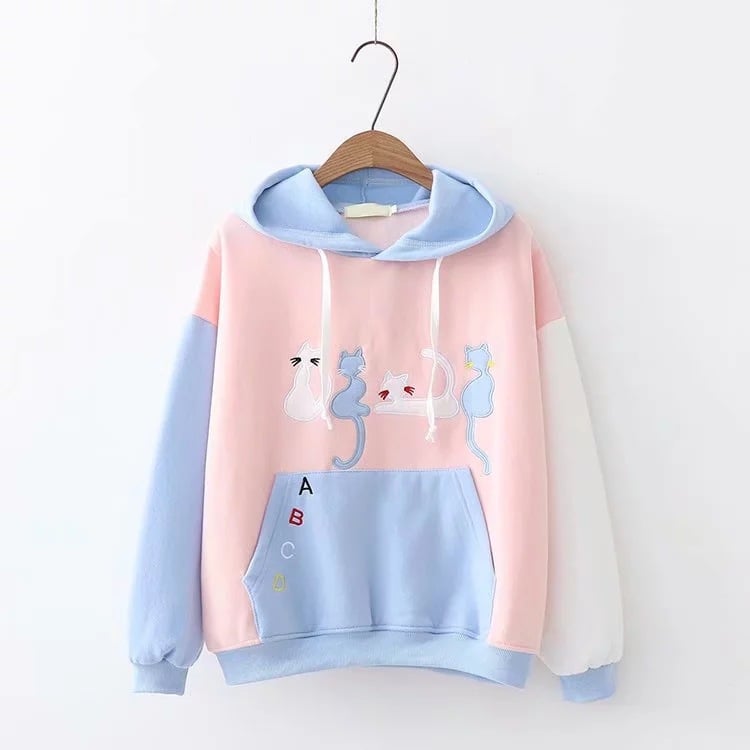Sweet Cartoon Cute Four Cats Embroidered Tether Hoodie