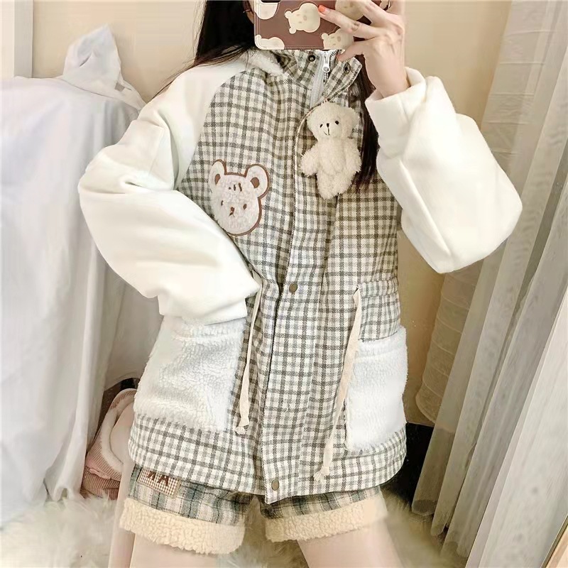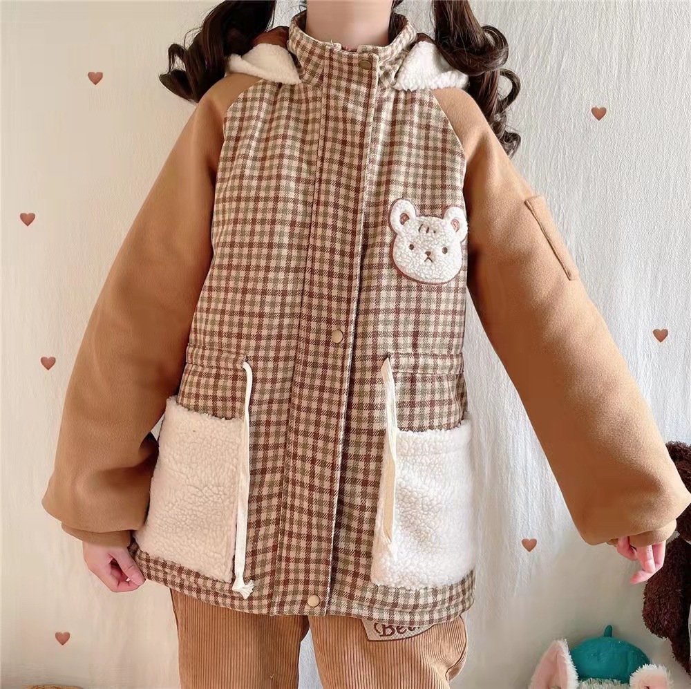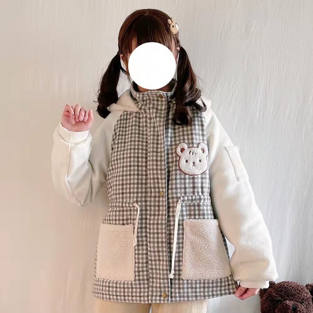 New style cartoon bear patch lamb wool stitching loose plaid cotton coat