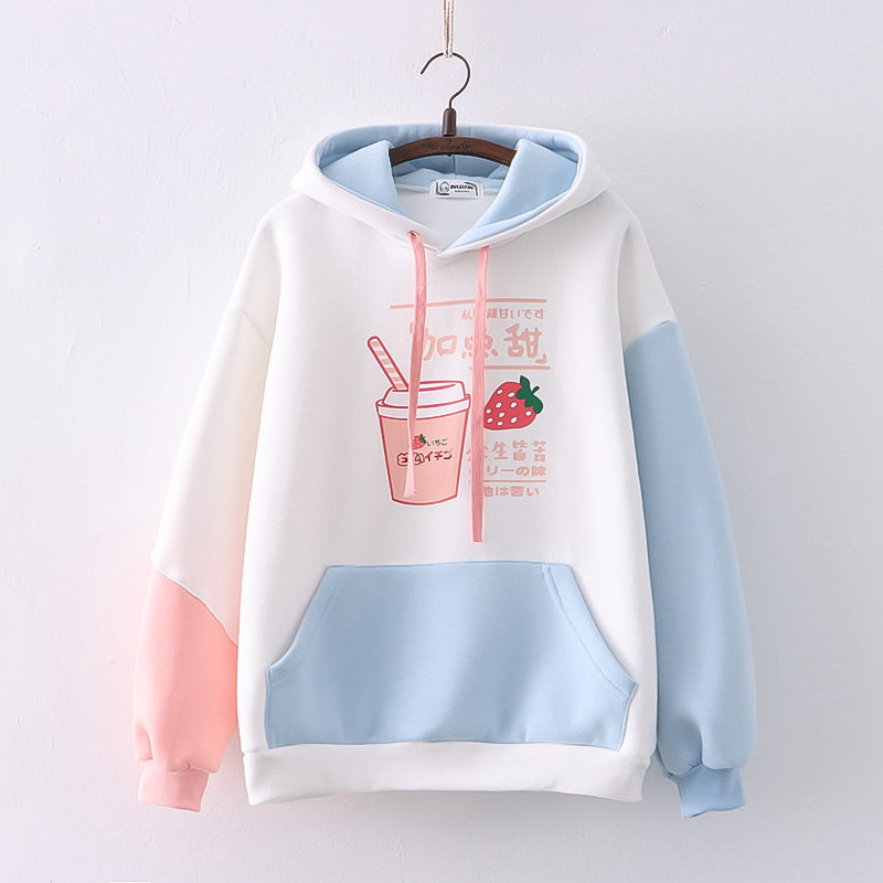 College Style Cartoon Drink Strawberry Print Hooded Plush Hoodie