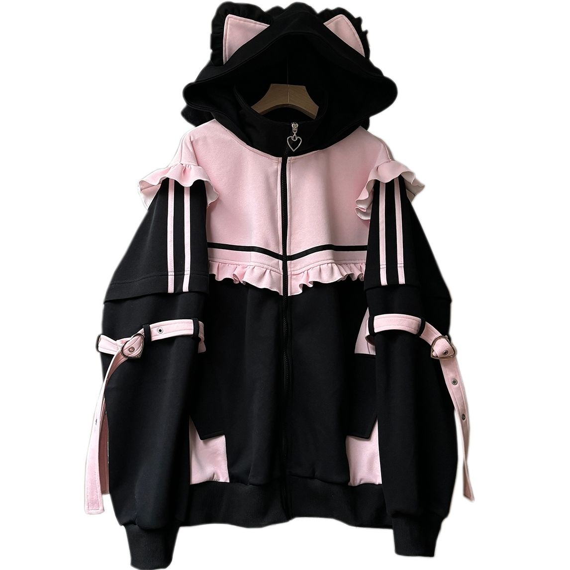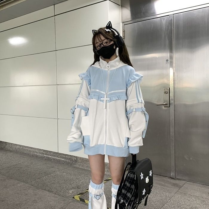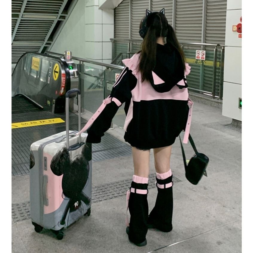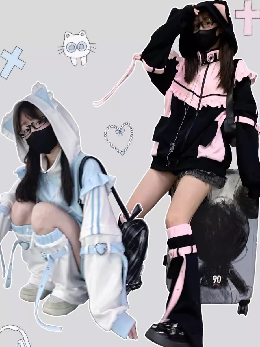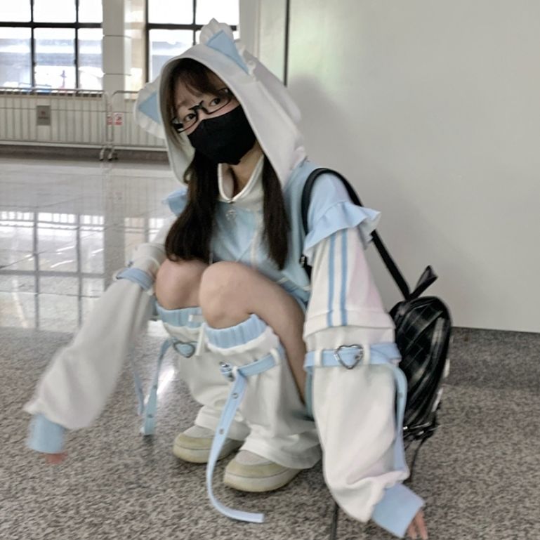 2D contrast color stitching long-sleeved ruffled hooded jacket + leg cover set